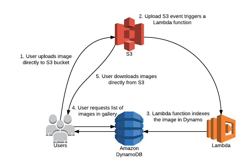 For image storage and retrieval, we'll use S3. To keep track of which images have been uploaded to which galleries, we are going to build an index of the images in S3 using Lambda. Instead of maintaining a server, we're going to have users run the AWS SDK in their browser to access S3 and Dynamo.