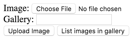 This renders to the incredibly beautiful layout below. There is a file picker, a text box to specify the gallery, a button that will trigger an image upload, and a button to list the images in the gallery.